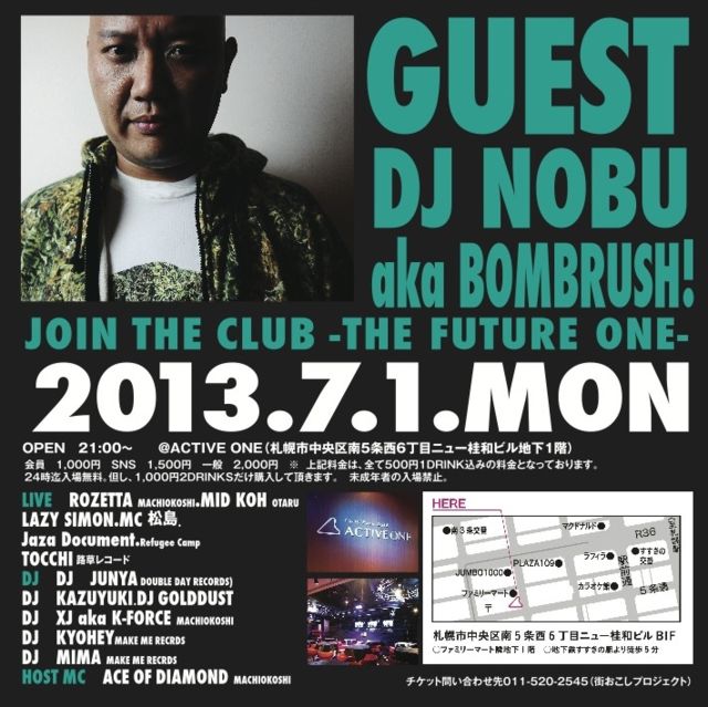 毎月様々なゲストに参加して頂き、 ゲストの皆様にも、週末とは違った選曲で、ヘッズから玄人まで 多くの音楽好き、パーティー好きな方々に、お楽しみ頂いております。 スペシャルゲスト参加の7月1発目の月曜日。l 札幌―帯広 と、人気のスニーカーNIKE AIR FORCE 1 30周年を記念し制作されたXBS、AKLOのTHE FUTURE ONEから端を発したMIX CD NITRAID presents 『 THE FUTURE ONES 』のリリースツアー北海道編の最終日。 ゲストには、DJにプロデューサーに活躍し、 日本のヒップホップシーン最重要人物の1人 DJ NOBU a.k.a. BOM