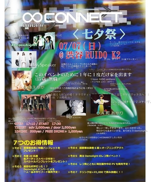 7/7(日)渋谷RUIDOK2 【Demolight present - ∞CONNECT - 七夕祭】 OPEN 17:10 / START 17:30 adv 2,000yen / door 2,500yen 1DRINK 500yen / FREE DRINK+ 1,000yen 出演 Demolight/Imika/しばえりか/一穂/月傘メロディ O.A. 町あかり (今回出演の決まっていたToySpeakerですが、メンバーの入院のため出演がキャンセルとなってしまいました。) http://ameblo.jp/demolighteventblog/entry-11564913911.html *先着20名様に、出演者全員のメッセージが入り七夕祭りのパンフをプレゼント(数に限りがございます) レコ