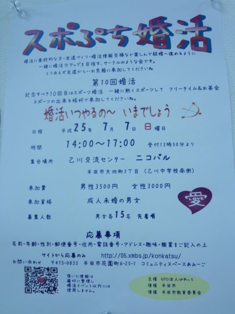 第10回婚活 【スポぷち婚活】 日程:25年7月7日 時間:14時〜17時 受付13時50分〜 場所:半田市乙川交流センター ニコパル (乙川中学校南側) 半田市大池町3丁目1番地 参加費:男性3500円女性3000円 参加資格:成人未婚男女 募集人数:男女各15名 先着順 お問い合わせ 応募はこのサイトhttp://05.xmbs.jp/konkatsu/ 主催 NPO法人ぱれっと 後援 半田市 半田市教育委員会