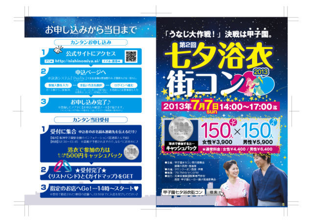 【七夕浴衣街コンって?】 http://nishinomiya.si/yukata2013/ 甲子園まちコン実行委員会の林です。 地元飲食店有志が中心に行う地域振興イベントです。 七夕の日、浴衣姿の男女が、甲子園界隈の飲食店を飲み食べ歩きしながら、運命の人と出会う・・・そんなイベントです。 阪神甲子園駅近辺の飲食店数店を貸切!お食事つき、飲み放題! コンセプトは「出会い」と「グルメ」と「地域活性」に「浴衣」というテーマを加えて、季節を感じながらみんなでわいわい楽しんじゃおう!という初夏の一大イベントです。 20歳以上の独身男女なら誰でもご参