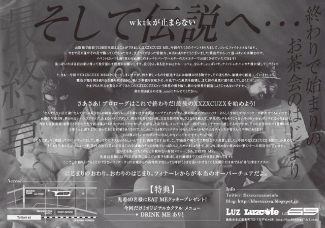 お陰様で前回で10回目を迎えることができましたXXZXCUZX ME。今回の7/13のイベントをもちまして、ついにファイナルとなります。今まで足を運びその足で踊ってくださった方々、支えてくださった皆様方、本当にありがとうございました!最後だからって湿っぽいのは嫌なので、イベントはいつも通り変わらぬ感じのオッペケペーでへルターのスケルターでお送りさせていただきます! 湿っぽいのは各自お家に帰って枕を湿らす程度にお願いします。泣くなよ。私も泣かねぇから…っべぇ、なんかしょっぱいや。ティッシュかハンカチ誰か貸してください! と