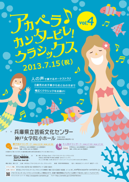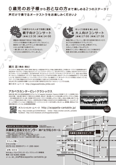 º£Ç¯¤âÄê´ü±éÁÕ²ñ¤ò³«ºÅ¤¤¤¿¤·¤Þ¤¹¡ª ¢¦¥³¥ó¥µ¡¼¥È¾ÜºÙ¢¦ ¡Ø¥¢¥«¥Ú¥é¥«¥ó¥¿¡¼¥Ó¥ì¡ª¥¯¥é¥·¥Ã¥¯¥¹vol.4 ¡Ù ¡ÚÆü»þ¡Û2013ǯ7·î15Æü(·î½Ë) [£±Éô] 13:30³«¾ì¡¿14:00³«±é [£²Éô] 17:00³«¾ì¡¿17:30³«±é ¡Ú²ñ¾ì¡Ûʼ¸Ë¸©Î©·Ý½Ñʸ²½¥»¥ó¥¿¡¼ ¿À¸Í½÷³Ø±¡¾®¥Û¡¼¥ë (ºåµÞ¿À¸ÍÀþ À¾µÜË̸ý±Ø¤è¤êÆî¤ØÅÌÊâ2ʬ) http://www1.gcenter-hyogo.jp/sysfile/center/07_acc_top.html ¡Ú½Ð±é¡Û¥¢¥«¥Ú¥é¥«¥ó¥¿¡¼¥Ó¥ì¥¯¥é¥·¥Ã¥¯¥¹ http://acappella-cantabile.jp/ ¡ÚºÂÀÊ¡ÛÁ´Àʼ«Í³Àʡң±Éô¡¦£²Éô´°Á´ÆþÂØÀ©¡Ó ¡¦Âç¿Í /1Éô \1,500(ÅöÆü\2,000) ¡¦Âç¿Í /2Éô