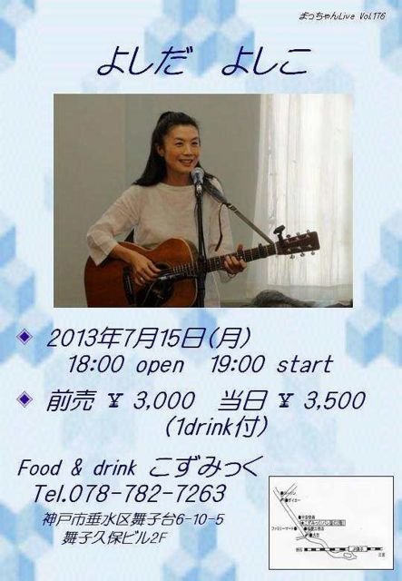 ¤è¤í¤·¤¯¤ª´ê¤¤¤·¤Þ¡¼¤¹¢ö ¤Þ¤Ã¤Á¤ã¤óLive Vol.176 ¡ù ¤è¤·¤À¡¡¤è¤·¤³ ¡ù Æü»þ¡§2013ǯ7·î15Æü¡Ê·î¡Ë18:00 open¡¿19:00 start ÎÁ¶â¡§Á°Çä 3,000±ß¡¿ÅöÆü 3,500±ß¡Ê1 drinkÉÕ¡Ë ²ñ¾ì¡§Food & drink ¤³¤º¤ß¤Ã¤¯ ¡¡¡¡¡¡¡¡Tel.078-782-7263 ¡¡¡¡¡¡¡¡¡¡¿À¸Í»Ô¿â¿å¶èÉñ»ÒÂæ6-10-5¡¡Éñ»Òµ×ÊÝ¥Ó¥ë2F