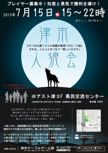 三重県津市にて話題の人狼会を行います! 人狼は1回30分程のパーティ推理ゲームです。 人狼ゲームを通して色々な人と楽しくおしゃべり・交流しましょう! という会です。どなたでも気軽にご参加いただけます。 開催日時:7月15日(月・祝) スケジュール 18:00〜 人狼1回目 19:00〜 人狼2回目 20:00〜 人狼3回目 21:00〜 人狼4回目 場所:アスト津3Fみえ県民交流センター 最寄り駅:津駅徒歩1分 募集定員:最低8名〜18名参加費:500円※お菓子・飲み物付 事前に参加予約をお願いしています。 ど