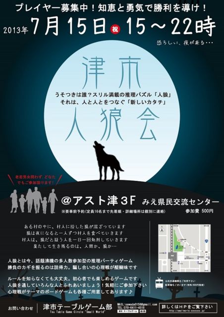 GW以来久々の祝日である7月15日、「人狼」をメインに色々なバリエーションの人狼系ゲームをまったりやろうと思います。 人狼系ゲームとはレジスタンスやカラヤのスルタン等、会話によってゲームが進行する推理系ゲームのことです。 その他ボードゲームも色々用意しておきますので、ゲーム中に死んでしまっても次のゲームまで暇を持て余すこともありません!← 観戦だけでもOKです(`・ω・´)昼さがりからコーヒー片手にゆったりまったり楽しみましょう。 詳しくは→http://smallworld.xxxxxxxx.jp/ まで 参加費:500円(おやつ・ド