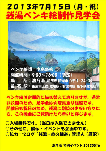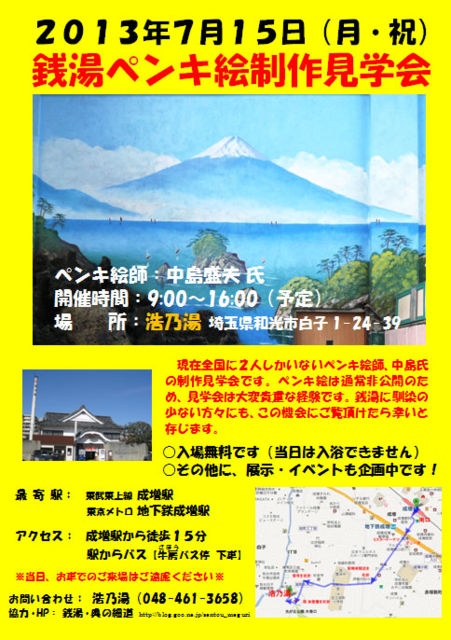 2013ǯ£··î£±£µÆü¡Ê·î¡¦½Ë¡Ë ºë¶Ì¸©¤Ç¤â¶þ»Ø¤Î¥ì¥È¥íÁ¬Åò¡Ö¹ÀǵÅò¡×¤Ç ¥Ú¥ó¥³¨»ÕÃæÅçÀ¹Éפµ¤ó¤Ë¤è¤ë¥Ú¥ó¥³¨À©ºî¤Î¸½¾ì¤ò¸«³Ø¤¹¤ë¥¤¥Ù¥ó¥È¤ò¹Ô¤¤¤Þ¤¹¡£ ¡ýÆþ¾ì̵ÎÁ¡ª¡ÊÅöÆü¤ÏÆþÍá¤Ï¤Ç¤¤Þ¤»¤ó)¡¡ÅÓÃæÆþÂà¾ì²Ä ¢£Æü»þ 2013ǯ7·î15Æü¡Ê·î¡¦½ËÆü¡Ë¡¡£¹¡§£°£°¡Á£±£¶¡§£°£°¡ÊͽÄê¡Ë ¢£¤È¤³¤í ¹ÀǵÅò ºë¶Ì¸©Ï¸÷»ÔÇò»Ò£±ÃúÌÜ24-39¡¡¡ÊÅìÉðÅì¾åÀþ À®Áý±Ø¤ª¤è¤ÓͳÚÄ®Àþ Ãϲ¼Å´À®Áý±Ø¡¡ÅÌÊ⣱£µÊ¬¤Û¤É¡Ë¡¡ ¾ÜºÙ¥Ú¡¼¥¸¢ª¡¡http://blog.goo.ne.jp/sentou_meguri/e/2ce95d870719629029df1cf4827775e3 Á¬Åò¤È¤¤¤¨¤Ð¡¢Éٻλ³¤Î¥Ú¥ó¥³¨¤ò