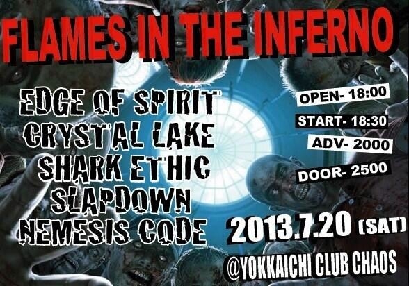 2013/07/20(sat)四日市CLUB CHAOS [FLAMES IN THE INFERNO] -CAST- EDGE OF SPIRIT CRYSTAL LAKE SHARK ETHIC SLAPDOWN NEMESIS CODE OPEN 18:00 / START 18:30 ADV \2,000- / DOOR \2,500- こちらも久しぶりの四日市 濃厚5バンド お問い合わせ、前売りチケットのキャッシャー取り置きは edgeofspirit@gmail.com へのメール、 管理人や自分へのmixiメッセージでも受け付けてます。 宜しくお願いします!