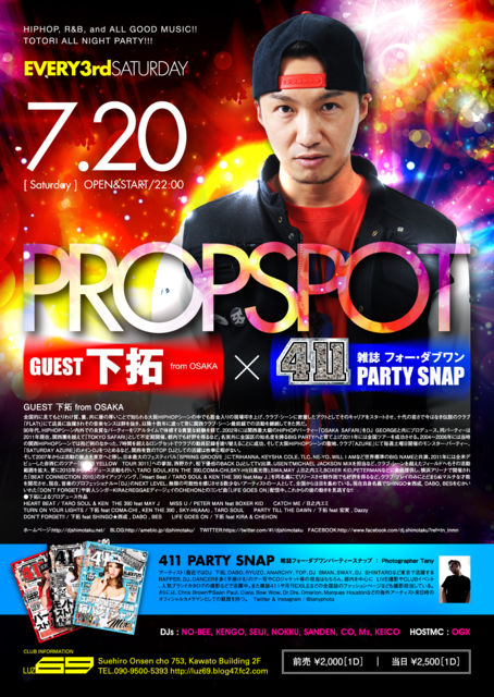 PROPSPOT2013 -GUEST 下拓×411PARTY SNAP- [HIPHOP/R&B] ■2013.7.20 SAT ■OPEN / START 22:00- ■@LUZ69 ■GUEST DJ 下拓 (from OSAKA) 全国的に見てもとりわけ質、量、共に層の厚いことで知られる大阪HIPHOPシーンの中でも筋金入りの現場叩き上げ、クラブ・シーンに密着したアクトとしてそのキャリアをスタートさせ、十代の若さで今はなき伝説のクラブ「FLATt」にて店長に抜擢されその音楽センスは群を抜き、以降十数年に渡って常に関西クラブ・シーン最前線での活動を継続してきた男だ。 90年代、HIPHOPシーン内外での良質な