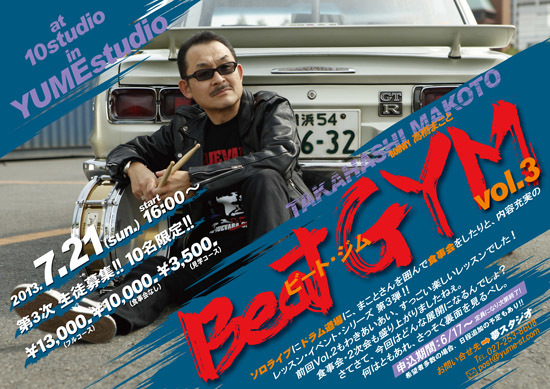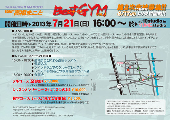 Beat GYM vol.3 開催日:2013年7月21日(日) 開催場所:Yume studio 10studio 住所 群馬県前橋市大友町3-12-5 アクセスJR新前橋駅から徒歩20分・新前橋駅西口よりタクシーで5分 開催時間: ■16:00〜18:00レッスン 高橋まことによる直接レッスン 質疑応答 ツインドラムでのグループレッスン レッスン参加者との写真撮影とサイン会 ■18:00〜20:00 高橋まことと一緒に食事会 なんと、全部参加すると4時間になります。 ■料金: ・フルコース(全参加)¥13,000 レッスン+写真撮影+食事会の当日全ス