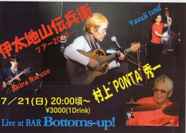 今月第三日曜日 午後8時〜 場所は鹿屋市大手町のボトムスアップ! 〒893-0009 鹿児島県鹿屋市大手町2−17 http://www.mapion.co.jp/phonebook/M01014/46203/24630232974/ オープニングアクト 7君 東ユージバンド!! 伊太地山伝兵衛 ギター&ボーカル http://www.fssweb.jp/den-bay/ http://www.youtube.com/watch?v=MGRs9VTZ0UM 石井康二 ウッドベース http://homepage2.nifty.com/mkes/bass/ 成瀬彰 ギター http://www.facebook.com/#!/akira.naruse.35?fref=ts 村上PONTA秀一 ドラ