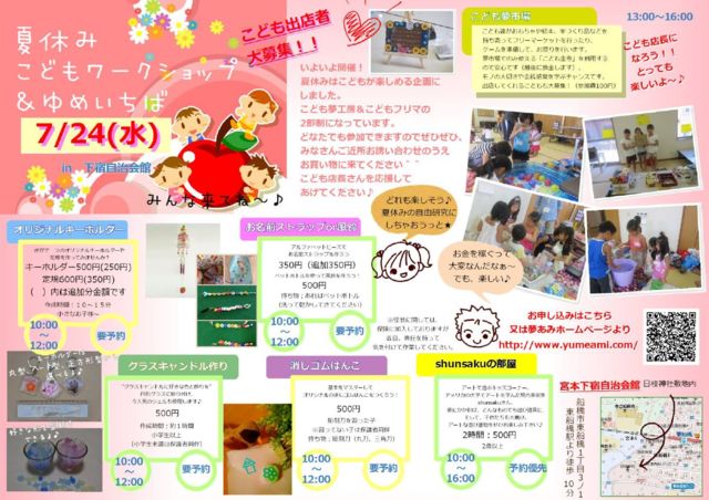 夏休みにこども夢工房と夢市場を開催いたします。 http://4104e324da0e5b96.lolipop.jp/about01/11-01.png 午前は楽しいこども向けワークショップ 午後はお祭りのようなこども夢市場。 ただのフリマとは違います。 射的やスーパーボールすくい、コイン落としの楽しいゲームが 子供価格で♪ また、使わなくなった子供達のおもちゃんの出店もあります。 こちらも子供価格で、お金のやりとりはこども夢市場でだけつかえる 『こども金券』を使うので安心。 お友達お誘いあわせの上、ぜひ遊びに来てください♪ こども夢市場の出店者