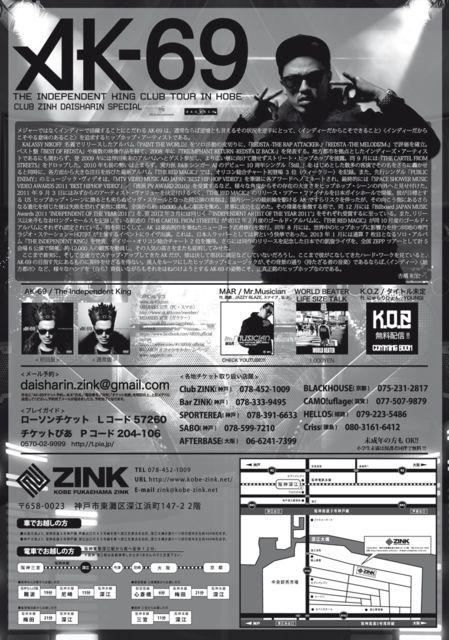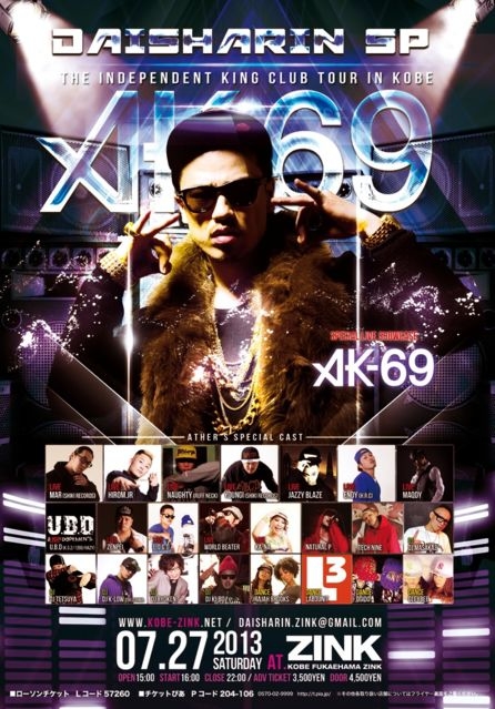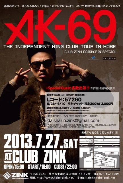 管理人様、告知失礼致します。 2013/7/27/sat 「AK-69」-THE INDEPENDENT KING CLUB TOUR IN KOBE 孤高のキング、さらなる高みへ!! 2年ぶりのフルアルバムを引っさげてREDSTAが神戸にやって来る!! 場所 : KOBE ZINK http://kobe-zink.net open :15:00 / close 22:00 前売 : 3500yen 当日 : 4500yen ※入場時に別途1ドリンク代必要 ローソンチケット 0570-084-005 http://l-tike.com/ ( Lコード 57260 ) チケットぴあ 0570-02-9999 http://t.pia.jp/ ( Pコード204-106 ) e+ http://eplus.jp/ ■SPECIAL GUEST L