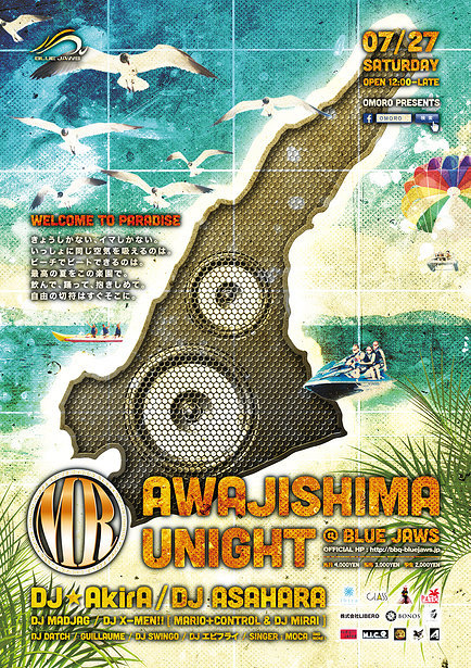 7/10時点 2200名参加受付済み。 名超え必須・・・ OMORO Presents [AWAJISHIMA UNIGHT] 7/27(sat)12:00〜20:00 3000名規模の超BIGパーティで最高の夏の始まりを・・・ 「淡路島の海に広大に広がる巨大なリゾートビーチ!1500坪の広大な施設では、 多数のマリン