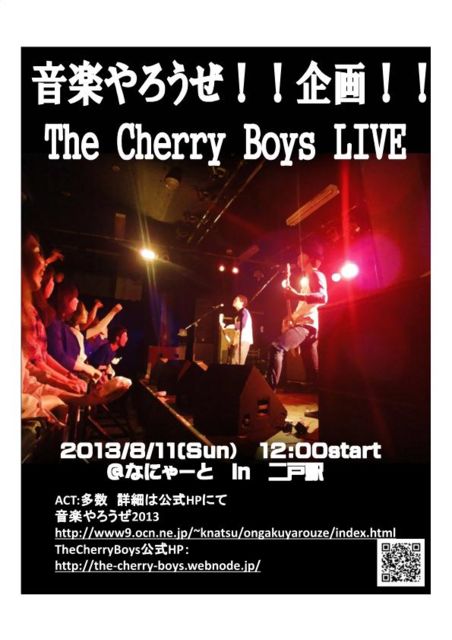7/27¤ÏË̾å¤Ç¿ÎµÁ¤Ê¤¥¢¥¿¥Ã¥¯²ñ´ë²èLIVE¡ª¡ª 8/11¤ÏÆó¸Í¤Ç²»³Ú¤ä¤í¤¦¤¼¡ª´ë²èLIVE¡ª¡ª¤Ë½Ð±é¤·¤Þ¤¹¡ª ¤½¤·¤ÆÈó¾ï¤Ë»Äǰ¤Ê¤ªÃΤ餻¤¬¤¢¤ê¤Þ¤¹¡ª¡ª7·î½é½ÜCDȯÇäͽÄê¤Ç¤·¤¿¤¬¡¢¥¢¥á¥ê¥«¤Î±¢ËŤ䡢¥¨¥¸¥×¥È¤Î¥¯¡¼¥Ç¥¿¡¼¤ä¡¢¥ä¥ó¥¡¼¥¹¹õÅĤÎÉÔ¿¶Åù¤Î±Æ¶Á¤ò¼õ¤±¡¢REC¤¬¤Ê¤«¤Ê¤«¿Ê¤Þ¤ºCDȯÇä¤Ï¾¯¤·±ä´ü¤Ë¤·¤¿¤¤¤È»×¤¤¤Þ¤¹¡ªÂçÊý¤ÎͽÁÛ¤ê¤È¤¤¤Ã¤¿´¶¤¸¤È»×¤¤¤Þ¤¹¤¬¡ª¡ª¡ª¿½¤·Ìõ¤Ê¤¤¤Ç¤¹¡ª¡ª ¾ÜºÙ¤Ï¸ø¼°HP¤Ç¥Á¥§¥Ã¥¯¡ª¡ªhttp://the-cherry-boys.webnode.jp/