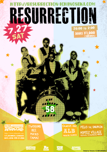 ÌÀÆü7/27(SAT) ABANZALE¤Ç¤ÏResurrection¤Ç¤¹¡£ START 20:00¡Á ¢¡2013. 7.27 (SAT) start 20:00 / finish 2:00 ¢¡DJ Bar ABANZALE in Ichinoseki http://www.abanzale.com/ ¢¡Charge : at door 1,000yen / 1drink ¢¡Genre HipHop, Jazz, Funk, Soul, R&B, Reggae, House and more good music. ¢¡Guest MC ALB¡ÊWACK TOWN¡Ë ¢¡DJs kazzy¡Ê·ç¾ì¡Ë TwoSuns Bee Ma'Ko Tamai ¢¡MCs HOMIEZ VILLAGE (Ozawa, Tatsumaro, Miken) Pelo the Snufkin ¢¡C&C¡ÊCashier & Camere¡Ë GANZY ¾Ü¤·¤¯¤Ï¥³¥Á