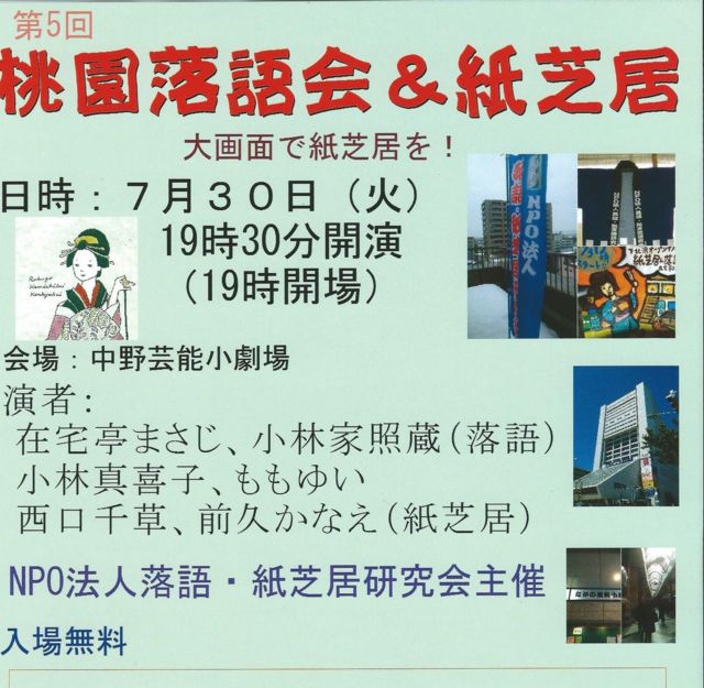 7月30日火曜日19時30分から「第5回桃園落語会&紙芝居」 を開催します。 NPO法人落語・紙芝居研究会主催。 http://mixi.jp/view_community.pl?id=5818920 http://raku-kami.com (公式ホームページ) プロジェクターで紙芝居を映します。 出演:在宅亭まさじ、小林家照蔵(落語) 小林真喜子、ももゆい 西口千草、前久かなえ(紙芝居) 入場無料。 ドン・キホーテの隣りのビルです。 よろしくお願いします。