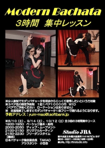 好評に付き3回限定の特別集中クラスも増設しました! 8月10日 予約枠はあと2ペアです。 7/30(火) Modern♪Bachata by TAKAO ★モダンバチャータ振付クラス★ 5月からの振り付けはこちらです。 http://www.youtube.com/watch?v=h-nC83eu7bs&feature=player_embedded ※ペア限定のスペシャルレッスン。 ■モダンバチャータ初級クラス 1ペア3000円(W1d) 20:00〜21:00 初級レッスン 21:00〜22:00 自由練習・フリータイム ※モダンバチャータベーシック・ディップ ディップ バリエィシ