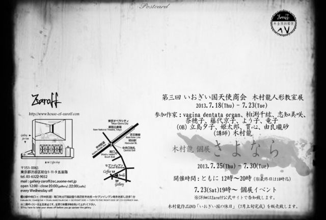 本日より人形教室展、1週間後に木村龍さん個展がございます。 私は教室展の方に、元講師としてゲスト参加します。 1年振りくらいの新作の球体関節少女人形を1体、出展致します。 また、DVD「いおぎい国の休日」では龍さんの詩を朗読させて頂きました。 個展イベントには、何かで出演するかも??(未定) 在廊は主に平日夜となります。ご来場お待ちしております。 +++++++++++++++++++++++++++++++++++++++++ 第三回 いおぎい国天使商会 木村龍人形教室展 2013/07/18(木) - 07/23(火) 12:00-20:00(水休) 参加作家:vagina