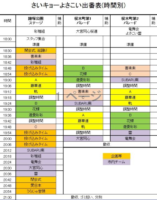 今年も恐縮ですが、平日に行われることになりました。 例年通り実施要項の作成が遅れています 前年との違いは ・前夜祭が無い(たていわ夏祭りでプレイベントの予定はあります。) ・更衣室は会場近くのテント ・スタートが遅い(18:30〜21:00位) ・参加協力費を半分以上カット(昨年は5000円、役員チームは10000円) って感じです。 それでも、あの大宮駅西口で踊ってくれるチームは是非とも来てください。 総踊りもいっぱいかけますよ〜!