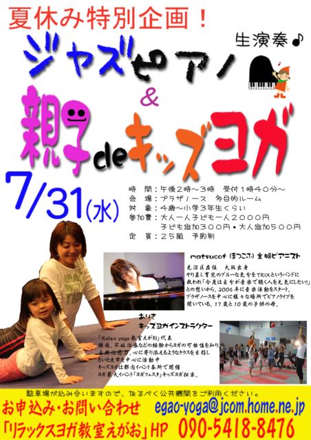 管理人様 この場を借りて失礼いたします。 さいたま市でヨガ教室を行っています「Rleaxyoga教室えがお」山口と申します。 今年の夏も「親子deキッズヨガ」イベント行います☆ 兼業主湯ジャズピアニストまつこふさんをお迎えして、ピアノ生演奏でお届け! ジャズピアノとヨガ? え〜? と思うかもしれませんが、 これが不思議とあうんです! リハーサル中何度鳥肌たったか! まつこふさんの奏でるメロディーが優しくて、ときには情熱的で! テーマは「夏!」あなたにとっての「夏」はどんなものですか? ヨガポーズで心と身体
