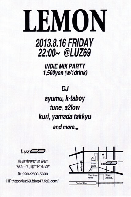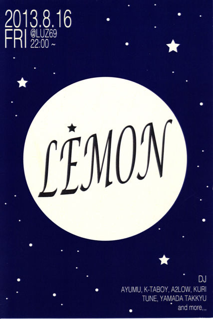 LEMON vol.4 2013.8.16 (Fri) 22:00〜LAST @Luz69 1,500yen(w/1drink) DJ's/ayumu/k-taboy/tune/a2low/kuri/yamada takkyu/ and...more indie party LEMON 真夏の夜の開催!!! 毎回異様にエキサイトするLEMONのvol.4 いつものぶっ壊れLEMONクルーにより 誰もがhappyになれるカラフルな音をお届けします。 音楽好きなアナタも、おしゃべり好きなアナタも、 お酒好きなアナタも、どの方も楽しめる刺激的な夜をご期待ください! 日常のあれこれを忘れて、たまにはドップリ音楽に浸かってみてはいかがでしょうか。 皆