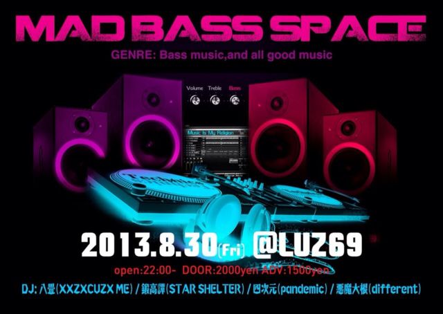 MAD BASS SPACE 【GENRE:Bass music,and all good music】 ■2013.8.30(Fri) ■open:22:00〜 ■DOOR:2000yen ■ADV:1500yen ■DJ 八畳(XXZXCUZX ME) 鍛高譚(STAR SHELTER) 四次元(pandemic) 悪魔大根(different)