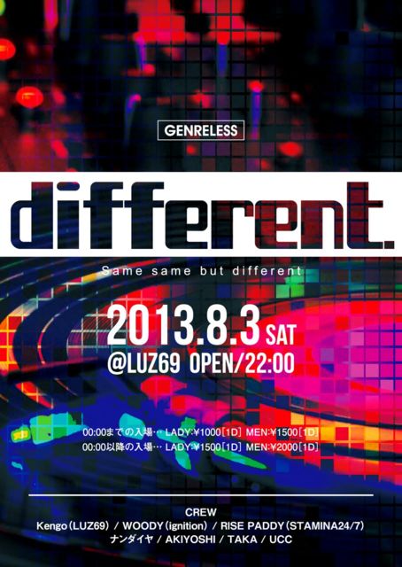 プロスノーボーダー山本祐士も前回からcrew参戦!! 若手発信の [みんな違ってみんないい!!] EVERY 1st SATURDAY GENRELESS PARTY different. [GENRELESS] ■2013.08.3(sat) ■OPEN/22:00 ■@LUZ69 ■DOOR /00:00迄の入場 LADY 1000(1D) MEN1500(1D) /00:00以降の入場 LADY 1500(1D) MEN 2000(1D) ■CREW Kengo(LUZ69) WOODY(ignition) RISE PADDY(STAMINA24'7) ナンダイヤ AKIYOSHI TAKA UCC ■Same same but different.