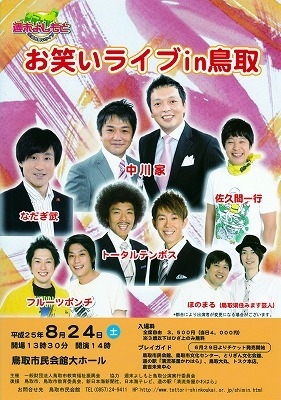 週末よしもと「お笑いライブ in 鳥取」が開催されます。  【日 時】  8月24日(土曜日) 14時開演  【会 場】  鳥取市民会館 大ホール          鳥取県鳥取市掛出町12番地         http://www.tottori-shinkoukai.or.jp/shimin.html  【料 金】  前売 3,500円/当日 4,000円  【出 演】  中川家          なだぎ武          トータルテンボス          佐久間一行          フルーツポンチ          ほのまる チケットは6月29日(土)発