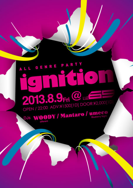 今週8/9金曜日はDJ-WOODY率いるgenreloess!! ignition vol.11 [ALL GENRE] ■2013.8.9 (Fri) ■OPEN / 22:00- ■@LUZ69 ■ADV /1500(1D) ■DOOR /2000(1D) ■DJs WOODY (different) Mantaro umeco (Blueberry Nigh) ■CONCEPT どこにでもいる平凡な学生が非日常的なクラブという空間でDJを通じて行う自己表現。楽しいことをすれば熱が生まれる。その熱が人を呼び、そしてignition(着火)されてより大きな熱となる。その熱で鳥取を動かしていく。 きっかけはすぐそこに。手を伸ばせばここに http://w