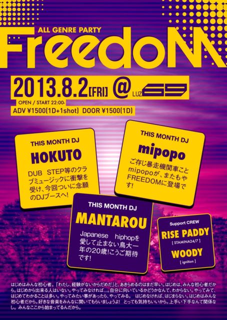 FREEDOM 2013 vol.8 [ALL GENRE] ■2013.08.02(Fri) ■OPEN/22:00 ■ADV /1500(1D+1shot) ■DOOR/1500(1D) ■@LUZ69 ■Djs ・HOKUTO (DUB STEP等のクラブミュージックに衝撃を受け、今回ついに念願のDJブースへ!) ・MANTAROU (Japanese hiphopを愛して止まない鳥大一年の20歳!こうご期待です!) ・mipopo (ご存じ暴走機関車ことmipopoがまたもやFREEDOMに登場です!) and...more ■Support CREW ・RISE PADDY(STAMINA24/7) ・WOODY(ignition) and...more 時には熱く、時にはしっと