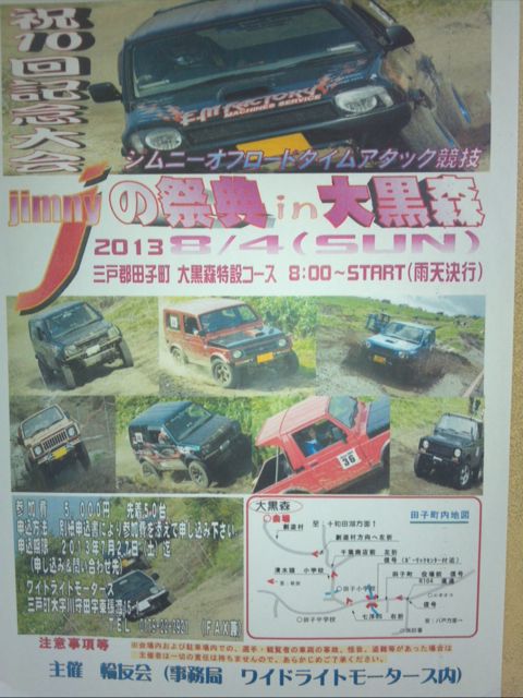 ジムニーオフロードタイムアタック競技 Jの祭典in大黒森 10 を開催します。 開催日時 2013年 8/4 (日) AM8:00〜受付開始 (雨天決行) 開催場所 田子町 大黒森オフロード特設コース 参加費 5.000円 先着 50台 申込方法 申込書により参加費を添えて申込みください。 申込期限 2013年8月2日(金)まで 当日エントリーもOKです! (当日エントリー希望の方は事前連絡お願いします) 申込み&問合せ先 ワイドライトモータース TEL0179-22-2921 (FAX兼) 担当 赤垣 以上宜