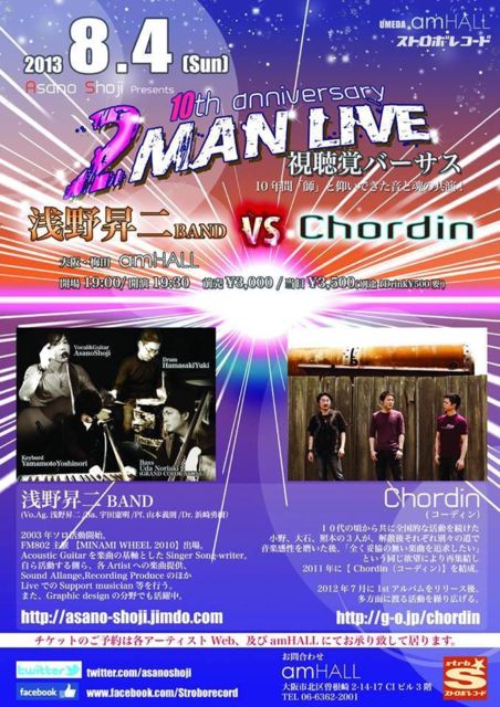 8/4(Æü)ÇßÅÄ amHALL AsanoShoji Presents 10th Anniversary 2-man LIVE ¡Ú»ëİ³Ð¥Ð¡¼¥µ¥¹¡Û ÀõÌÆóBAND vs Cordin (½Ð±é)ÀõÌÆóBAND / Chordin (»þ´Ö)³«¾ì19:00/³«±é19:30 (Ticket)Á°Çä¡ï3,000 / ÅöÆü¡ï3,500(ÊÌÅÓ1DrinkÂå¡ï500) ¢¨Ãæ³ØÀ¸¤Þ¤Ç¥Á¥±¥Ã¥ÈÎÁ¶â̵ÎÁ(ÊÌÅÓ1DrinkÂå¡ï500) ÇßÅÄ amHALL (½»½ê)Âçºå»ÔË̶èÁ¾º¬ºê2-14-17 CI¥Ó¥ë3³¬ (TEL)06-6362-2001 (Web site)http://amhall.jp/ 2003ǯ¥½¥í³èư³«»Ï¤«¤éº£Ç¯¤Ç10ǯ¡£ »Õ¤È¶Ä¤¤¤Ç¤¤¿[¾®ÌîÂç²ð(ex. CRAM-BO)]»á¤Î ºÇȯư3PeaceBAND [Chordin
