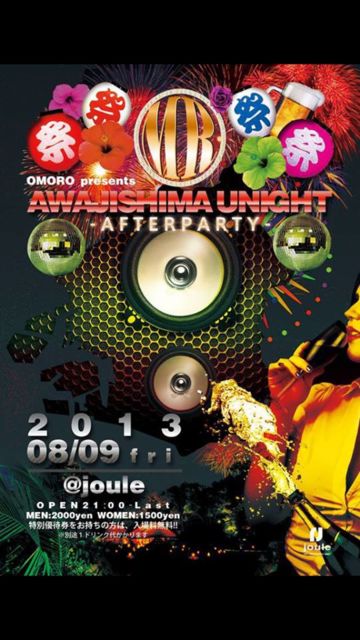 OMORO Presents [AWAJISHIMA UNIGHT¡¡AFTER¡¡PARTY] Special Summer Party 2013¢ö 8/9¡Ê¶â¡Ë21¡§00¡ÁMIDNIGHT ÃËÀ2000±ß¡Ê1DÉÕ¤¡Ë½÷À1000±ß¡Ê1DÉÕ¤¡Ë ¥¯¥é¥Ö@¡Øjoule¡Ê¥¸¥å¡¼¥ë¡Ë¡Ù´°Á´ÂßÀÚ ¥Ó¥¢¥¬¡¼¥Ç¥ó¡¦²°Âæ¤Ç¤Ï¤ª¿©»ö¤â³Ú¤·¤á¤Þ¤¹