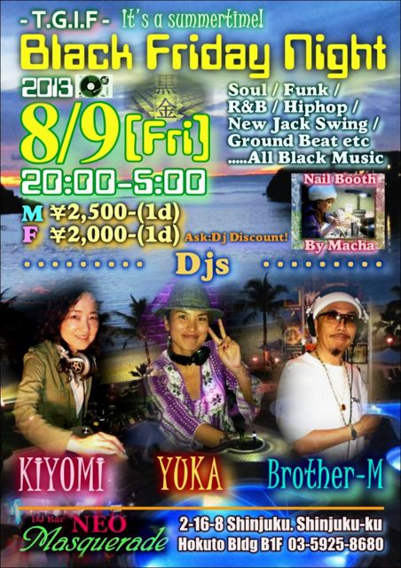____________¡¡8/9(Fri)¡¡¹õ¡¡¶â¡¡Information¡¡______________ ¤¤¤Ä¤â¤´ÍèŹ¤¢¤ê¤¬¤È¤¥¤´¤¶¤¤¤Þ¤¹¡ùÀè²ó7/12¤âޤÂô»³¤ÎÊý¡¹¤Ë¤´Íè¾ì ĺ¤¤Þ¤·¤Æ¤¢¤ê¤¬¤È¤¥¤´¤¶¤¤¤Þ¤·¤¿ ¤µ¤ÆŽ¤£¸·î¤ÎÂ裲½µ¶âÍˤϡ¢¤ªÆëÀ÷¤ßDj KIYOMI¤ÈDj Brother-M¤Ë²Ã¤¨ Ai-Club,Groovy,MagicÅù¡¹¤Ç³èÌöÃæ¤Î¤ªÆëÀ÷¤ßDj YUKA¤ò·Þ¤¨¤ªÂ£¤ê Ãפ·¤Þ¤¹¡ªYUKA¤ÏNeo Mas½éÅоì¤Ç¤¹ It's a summertime¡Á^^b ¤Ê¤ó¤È¤¤¤Ã¤Æ¤â¤¢¤ÎYUKA¥¹¥Þ¥¤¥ë¤È¥á¥í¡¼¤Ç¥¥ã¥Ã¥Á¡¼¤ÊÁª¶Ê¤¬Ì¥ÎϤΠDj YUKA¡ù ¤³¤ÎÆü¤âÌÌÇò¤¯¹õ¤¤Groove¤Ë¤Ê¤ê¤½¤¦¤Ç¤¹=*¡°-¡°*= ¤¤