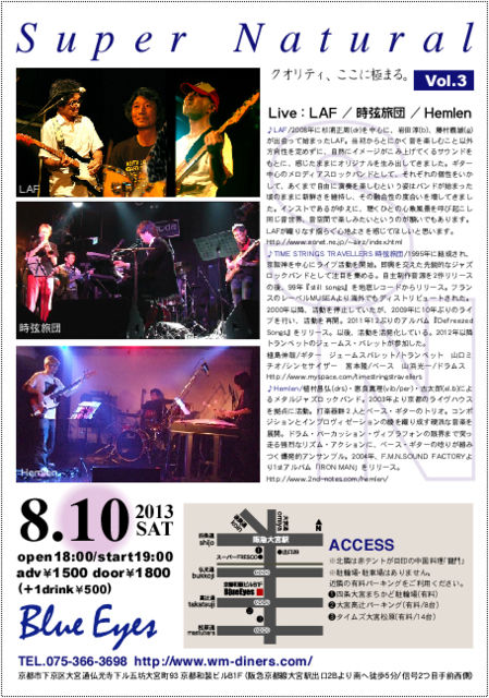 ¡ú8·î10Æü(ÅÚ)¡¡Super Natural vol.3 open18:00/start19:00/adv¡ï1500 door¡ï1800(¤È¤â¤Ë¡Ü1drink¡ï500) Live¡§LAF / »þ¸¹Î¹ÃÄ / Hemlen ¢öLAF 2008ǯ¤Ë¿ù±ºÀµ¼þ(dr)¤òÃæ¿´¤Ë¡¢´äÅĽß(b)¡¢Æ£Â¼µÁͺ(g)¤¬½Ð²ñ¤Ã¤Æ»Ï¤Þ¤Ã¤¿LAF¡£ Åö½é¤«¤é¤È¤Ë¤«¤¯²»¤ò³Ú¤·¤à¤³¤È°Ê³°Êý¸þÀ¤òÄê¤á¤º¤Ë¡¢¼«Á³¤Ë¥¤¥á¡¼¥¸¤¬¤³¤ß¾å¤²¤Æ¤¯¤ë¥µ¥¦¥ó¥É¤ò¤â¤È¤Ë¡¢´¶¤¸¤¿¤Þ¤Þ¤Ë¥ª¥ê¥¸¥Ê¥ë¤òÀ¸¤ß½Ð¤·¤Æ¤¤Þ¤·¤¿¡£¥®¥¿¡¼Ãæ¿´¤Î¥á¥í¥Ç¥£¥¢¥¹¥í¥Ã¥¯¥Ð¥ó¥É¤È¤·¤Æ¡¢¤½¤ì¤¾¤ì¤Î¸ÄÀ¤ò¤¤¤«¤·¤Æ¡¢¤¢¤¯¤Þ¤Ç¼«Í³¤Ë±éÁÕ¤ò³Ú¤·¤à¤È¤¤¤¦»Ñ¤Ï¥Ð¥ó¥É¤¬»Ï¤Þ¤Ã¤¿º¢¤Î¤Þ¤Þ¤Ë¿·Á¯¤µ¤ò°Ý»ý¤·¡¢¤½