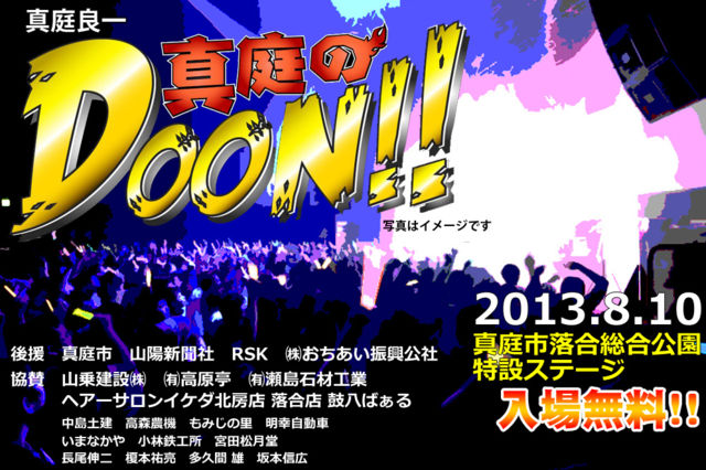 http://m-doon.com/index.html 平成25年8月10日(土)13:00〜18:00 場所 真庭市落合 白梅総合公園ゲートボール場 (雨天でも決行できる) 入場 無料 「真庭市公共バスまにわくん」との連動 主催 「真庭良一 真庭のDOON!」実行委員会/ 実行委員長 多久間 雄 真庭のDOON!とは、岡山県は真庭市で開催される、郷土に対する思い、 未来へのメッセージをオリジナル曲や各種表現作品に込めて発表するイベントです。