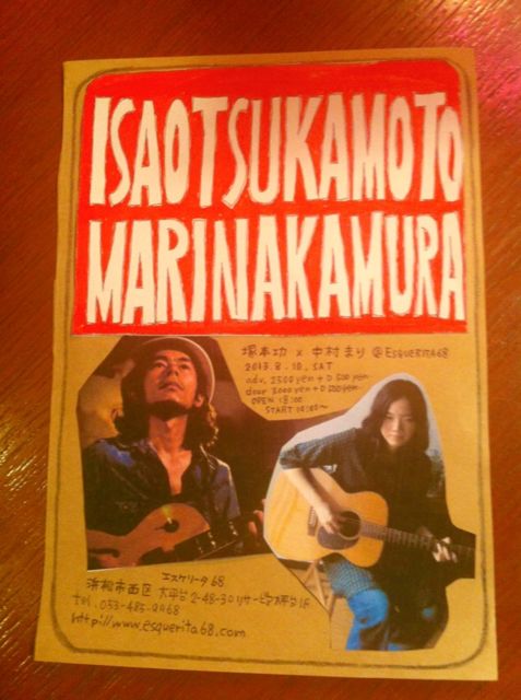 8/10(SAT)塚本功×中村まり 開場18:00/開演19:00 前売2500円(D別)/当日3000円(D別) 限定40名様! 問い合わせ:ESQUERITA68 http://www.esquerita68.com esquerita68@gmail.com 053-485-9968 ★塚本功 http://isao-tsukamoto.net/ 塚本功(つかもといさお):ギタリスト。 愛器ギブソンES175をアンプに直結した唯一無二の演奏スタイルで、数々の客演や、バンド活動、ソロ活動と、実に多忙な日々を送っている魔法のギタリスト。自ら率い歌うバンド、ネタンダーズを筆頭に、ピラニアンズ、スライマングース、ハローワークスのメンバーとし