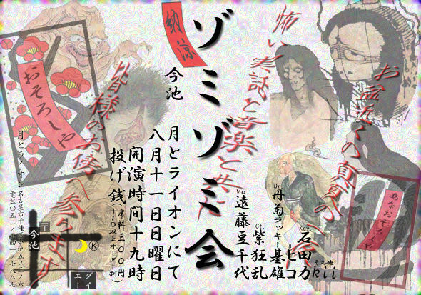 〜ゾミゾミ会〜 Vo:遠藤豆千代(豆異℃、元なぞなぞ商会…) G:紫狂乱(元なぞなぞ商会) Dr:丹菊ラッキー基雄(元なぞなぞ商会) B:ヒコ(HIKOS!元ピヴレヌ、原爆オナニーズ…) kb:石田力(ピアノ弾語リスト) その他:kii(豆異℃) による、真夏の一夜の夢物語 〜お盆近くの真夏の一夜 怖い実話と音楽と共に 皆様のお傍へ参ります〜 日時:8月11日(日) PM19:00スタート 場所:「月とライオン」 投げ銭(席料300円+1D以上オーダー) 皆様のお越しをゾミゾミお待ちしております。 ☆チラシは豆異℃ブー