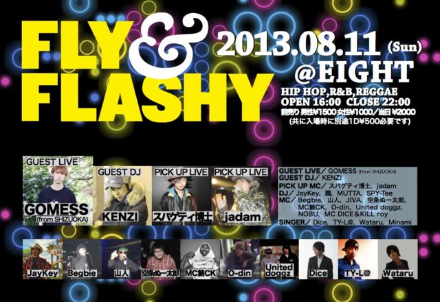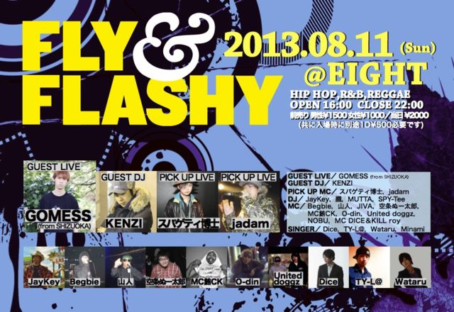 8月11日(日) 『FLY&FLASHY vol.72』 @EIGHT NAGOYA OPEN 16:00/CLOSE 22:00 ADV 男性¥1500、女性¥1000/DOOR ¥2000 (共に入場時別途1DRINK ¥500必要です) HIP HOP,R&B,REGGAE,ALL MUSIC ★GUEST LIVE★ GOMESS (from SHIZUOKA) ★GUEST DJ★ KENZI ★PICK UP MC★ スパゲティ博士,jadam ★DJ★ JayKey,朧,MUTTA,SPY-Tee ★MC★ Begbie,山人,JIVA,空条ぬー太郎,MC鮪CK,O-din,United doggz,NOBU,MC DICE&KILL roy ★SINGER★ Dice,TY-L@,Wataru,Minami ◆第72回