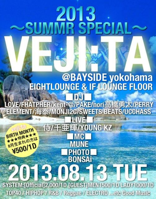 ´ÉÍý¿ÍÍ͹ðÃΤò¼ºÎ餤¤¿¤·¤Þ¤¹¡ª¡ª ¥¨¥ó¥È¥é¥ó¥¹¤Ç¡Ø¥Ù¥¸¡¼¥¿¡Ù¤Î¥²¥¹¥È¤ÇºÇ°ÂÃͥǥ£¥¹¥«¥¦¥ó¥È¡ª¡ª ²£ÉÍÊ¿ÆüºÇÂ絬ÌϤΣ²¥Õ¥í¥¢Å¸³«¥Ñ¡¼¥Æ¥£¡¼¡ª¡ª ¤¼¤Ò¡¢¤ß¤Ê¤µ¤ó¤ªÂÔ¤Á¤·¤Æ¤ª¤ê¤Þ¤¹¡ª¡ª ¡ØVEJI:TA¡Ù ¢£Ëè·îÂ裲²ÐÍËÆü¡ª ²£ÉÍBAYSIDE¤Ë¤Æ³«ºÅ¡ª¡ª¡ØVEJI:TA¡Ù EIGHTLOUNGE & IF LOUNGE FLOOR¡¢£²¥Õ¥í¥¢¹Ô¤Í輫ͳ¤ÎÊ¿Æü²£ÉͺÇÂ絬ÌÏNo.1 Party¡ª¡ª ¢£Ê¿Æü¤Ç¤â¤ª¼ò¤ò³Ú¤·¤¯°û¤ß¤¿¤¤¡ªGood Music¤ÇÍ٤ꤿ¤¤¡ª¥¹¥È¥ì¥¹¤òȯ»¶¤·¤¿¤¤¡ª¤½¤ó¤Êµ¤»ý¤Á¤ò»ý¤Ã¤¿Party People¤ÎÊýÂç´¿·Þ¤Ç¤¹ EIGHTLOUNGE¤Ë¤Ï¹ë²Ú¤Ê¥½¥Õ