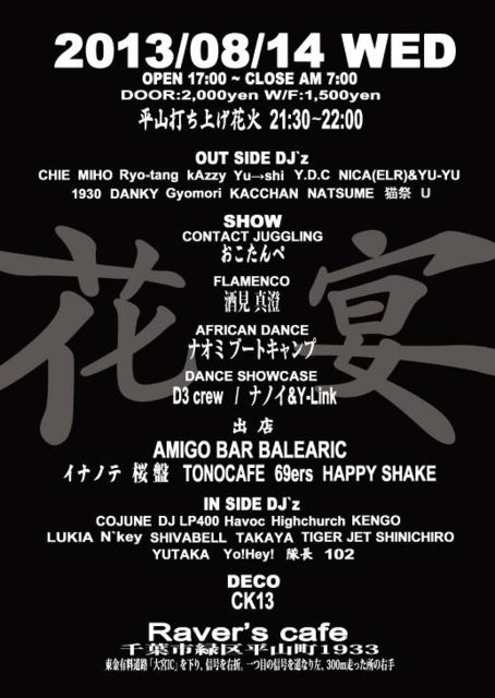 ¦×¦×¦×²Ö±ã¦×¦×¦× £¸·î£±£´Æü¡Ê¿å¡Ë open17:00~close 7:00 door:2000yen W/F:1500yen ½Ð±é¼Ô <contact juggling> ¤ª¤³¤¿¤ó¤Ú <flamenco> ¼ò¸« ¿¿À¡ <african dance> ¥Ê¥ª¥ß¥Ö¡¼¥È¥¥ã¥ó¥× <dance showcase> D3 crew ¥Ê¥Î¥¤&Y-Link <out side DJ> CHIE/MIHO/Ryo-tang/kAzzy/Yu¢ªshi/Y.D.C NICA¡ÊELR)&YUYU/1930/DANKY/Gyomomi HIRAGA/KACCHAN/MTM/NATSUME/Ǻ×/U <in side DJ> COJUNE/DJ LP400/Havoc/Highchurch/KENGO/LUKIA N`key/SHIVABELL/TAKAYA/TIGER JET SHINICHIRO YUTAKA/Yo!Hey!/ÂâĹ/£±£°£² ½ÐŹ AMIGO BA