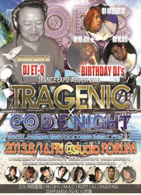 管理人様、告知失礼致します。 TRAGENIC 〜TRANCE EXPO August.2013〜 動き出した新世界の秒針!六本木×新宿の奇跡のコラボレーション!! 6月の「KENZI」「OVERHEAD CHAMPION」「OVERFLOW」「Rinrin」 7月の「TRAGENIC×MEGA TRANCE×ORGA☆NIGHT」と2ヶ月連続満員御礼、絶賛大盛況にて開催されたTRAGENIC〜TRANCE EXPO〜!! 8月のTRANCE EXPOは六本木×新宿、時を越えた奇跡のコラボレーションが実現!! 【TRAGENIC×CODE NIGHT】!! メインフロアは、 数年前なら誰もが知ってる伝説のアフターパーティーSUNDAY MORNING PARTYこと