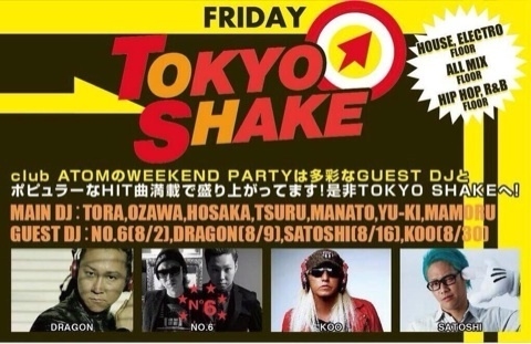 興味の無い方失礼します。 今夜は【TOKYO SHAKE@渋谷ATOM】開催!!!! 1Fのエントランスにて【まさわい】のゲストで【まさ】で何方でも最安値でご入場頂けます。 華金の夜は【Club ATOM】で決まり!! 今夜、皆さんとお会い出来るのを楽しみにしています!! 8/16(Fri) 【TOKYO SHAKE@渋谷ATOM】 -ALL MIX FLOOR- DJ:TORA,OZAWA,TSURU,HOSAKA,YU-KI,MANATO,MAMORU Guest DJ:SATOSHI VJ:MiNORi Fumiya(from GRIFFIN PROJECT) -HOUSE ELECTRO FLOOR- DJ:HARU,KAZMA,HiDEKi,YAGINUMA,MASA-Y,KOTOMI,KENTA,KENK