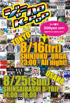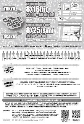 “ジャニハロK-POPナイト” 【特集】 J:中居正広生誕祭☆SMAP/「Hey!Sexy-Ft2-z」 H:夏焼雅生誕祭☆Berryz工房/「きっかけ=研修生(仮)」 K:GD生誕祭☆BIGBANG/「POP☆ハリケーン(ex)」 日時:8/16(金)23:00〜All Night! 会場:新宿URGA 03-5287-3390 住所:新宿区歌舞伎町2-42-16第二大滝ビルB1 http://www.urga.net/ 料金:¥2000(1d別) 参加表明割:¥1500(1d別) ※twitterにてRT、又はmixiトピックに書き込みで¥500オフ! DJ&VJ:ひろりん/魅惑のクニオ♂/etc Selector:リサ天狗/けーちゃむ/星のカービィ/サキ