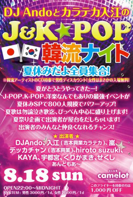 Ëè²ó¿¤¯¤Î·Ýǽ¿Í¡¢²Î¼ê¡¢¥â¥Ç¥ë¡¢¶È³¦¿Í¤Ê¤É¤¬½¸¤Þ¤ëº£ºÇ¤âÏÃÂê¤Î¡¢µÈËܷݿͤÈK.Ando¤Î¼çºÅ¤¹¤ëJ-POP&K POP NIGHT