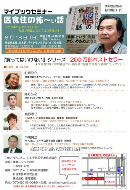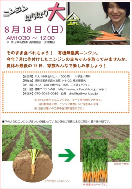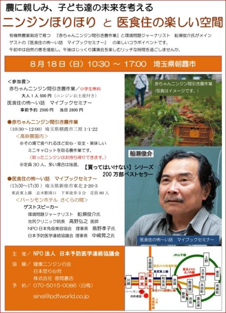 「買ってはいけない!」シリーズ200万部ベストセラー 環境問題ジャーナリスト 船瀬俊介氏 講演会 開催! ━━━━━━━━━━━━━━━━━━━━━━━━━━ ニンジン掘り堀り & 真夏の怪談「医食住の怖〜い話」 https://www.facebook.com/events/335485939915095 ※ご予約はこちら⇒ http://www.funase.info/form.html ━━━━━━━━━━━━━━━━━━━━━━━━━━ 農に親しみ子ども達の未来を考える ニンジンほりほり と 医食住の楽しい空間 8月18日(日)10:30〜17:30 有機無農薬栽培で育つ 『赤ちゃんニン