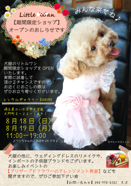こんにちは!犬服のリトルワンは、 8月18(日)〜19日(月)の2日間にかけて展示即売会を開催いたします。 詳細はこちら! 【日時】 2013年8月18日(日)、19日(月) OPEN:11:00〜CLOSE:19:00 【場所】 レンタルギャラリーQUADRO(クアドロ)さん 埼玉県さいたま市大宮区大門町3-22-14-1 ※大宮駅東口からまっすぐ歩いて約5分です。 当日はプリザーブドフラワー教室なども開催しますので、 お子様の夏休みの宿題にいかがですか? 犬服の他に、子供服やベビー服のインポートやオーダードレスの受注会も 行いますのでご来店お待ちして