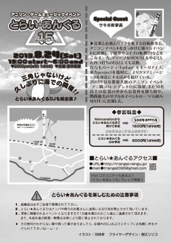 今年より偶数月の定期開催!とらい★あんぐる! しかも今回はいつもの会場te:Dを飛び出して熊本新港での開催だ! また今回も関西よりゲストDJさんをお招きしてます! 前回ふぉーてぃーんに出演いただいたPETTERさんが一目惚れしたと噂を聞いた サキ@幹事長 from 大阪 をお呼びいたしました! サキさんのプロフィールです 音楽とお酒とパスタを愛する自称幹事長。 アニソンイベントをきっかけに様々なイベントに出演し、学園祭やライブの転換DJなどをこなす一方、ディープなHOUSEを中心とした四つ打ちのDJとしても活動。