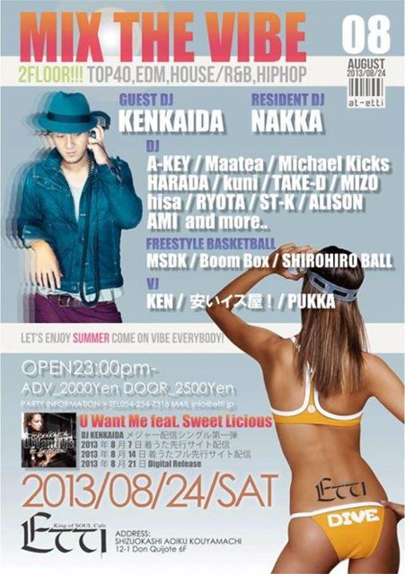 ´ÉÍý¿ÍÍÍ¡¢¹ðÃμºÎéÃפ·¤Þ¤¹¡£ ¡ØMIX THE VIBE¡Ù @Etti 2Floor!! Top40,EDM,HOUSE / R&B,HIPHOP open 23:00 ADV 2000Yen DOOR 2500Yen -GUEST DJ- KENKAIDA -RESIDENT DJ- NAKKA -DJ- A-KEY Maatea Michael Kicks HARADA kuni TAKE-D MIZO hisa RYOTA ST-K ALISON AMI -FREESTYLE BASKETBALL- MSDK Boom Box SHIROHIRO BALL -VJ- KEN °Â¤¤¥¤¥¹²°! PUKKA DJ KENKAIDA JELLY¥â¥Ç¥ë"¤Þ¤¤¤Á"¤³¤È¹â¶¶¿¿°Í»Ò¤ò¥«¥Ð¡¼¥â¥Ç¥ë¤Ëµ¯ÍѤ·¤¿R&