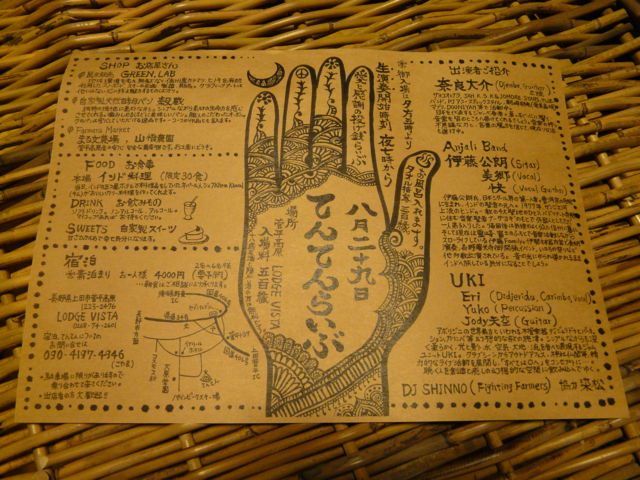 管理人様 告知失礼いたします。 てんてんらいぶ 日時 8月29日 ご入場夕方5時より 生演奏夜7時〜 入場料500縁 場所 長野県上田市菅平高原1223-2476 LODGE VISTA (ロッジヴィスタ内) 愛と感謝の投げ銭らいぶ 〜出演者〜 ・奈良大介(ジャンベ、ギター、三線) http://www.naradaisuke.com/ ・Anjali band 伊藤公朗(シタール) 伊藤美郷(ヴォーカル) 伊藤快(ヴォーカル、ギター) http://www.anjalimusic.jp/ ・UKI Eri(ヴォーカル、ディジュリドゥ、カリンバ
